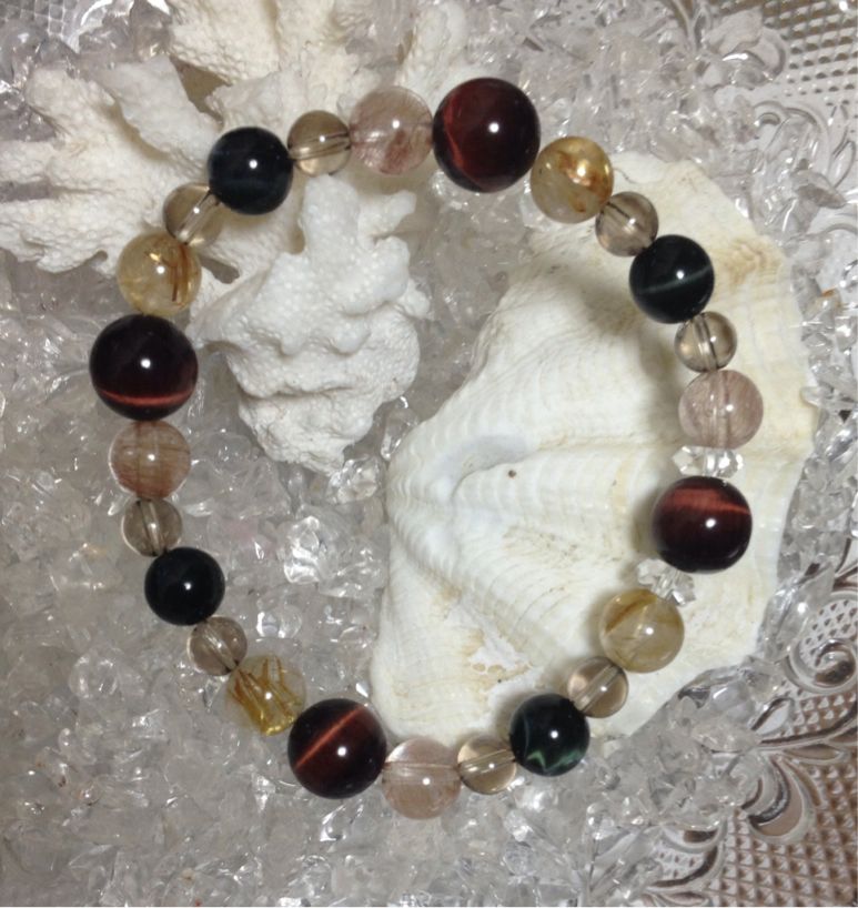 レッドタイガーアイ、ルチルクォーツ、スモーキークォーツのブレスレットです。