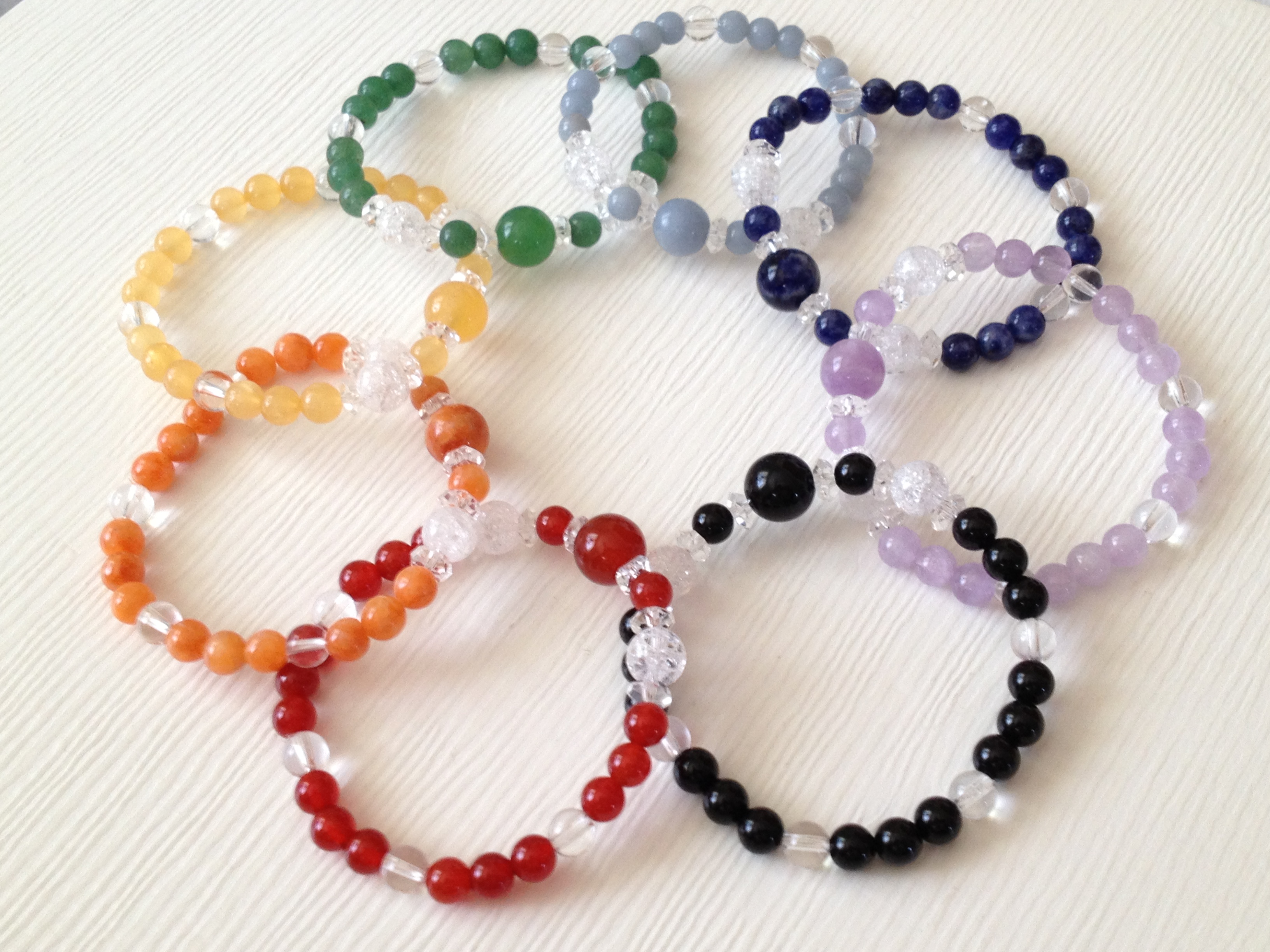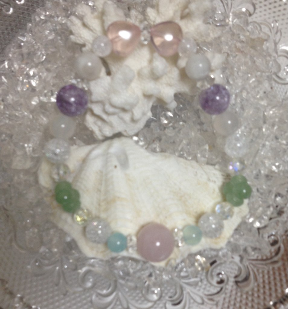 シトリン、ローズクォーツ、水晶、アメジスト、プレナイトのミックスストーンと、ジェダイド、カルセドニー、ブルーレースアゲードの6ミリ玉でカラフルで可愛いブレスレットになりました。
