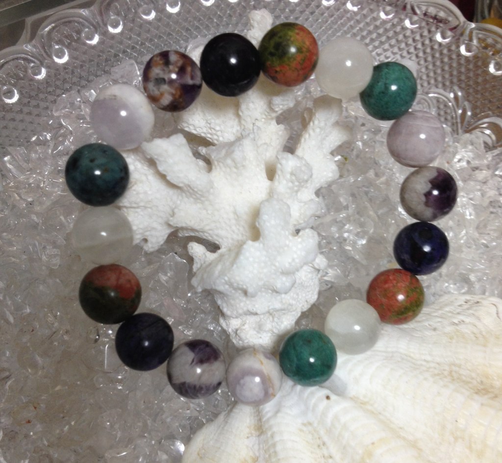 スギライト、ムーンストーン、ミックスアメジスト、ドラゴンブラッドジャスパー、ユナカイトを使用しています。