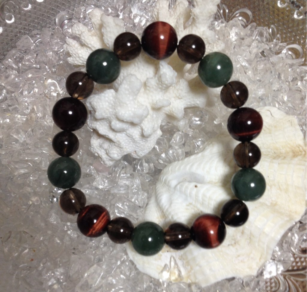 S様は前々から.誕生石の翡翠が欲しいとの事で、レッドタイガーアイとスモーキークォーツの元気、運気アップのブレスレットになりました。