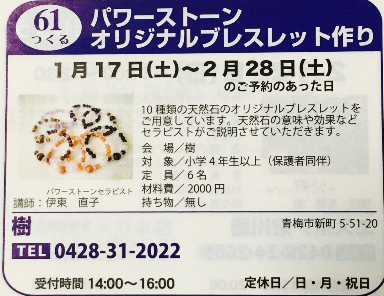 チラシはまだ、出来上がっないですが、カフェ&ギャラリー 樹さんでパワーストーンのワークをさせていただく事になっています。(o^^o)