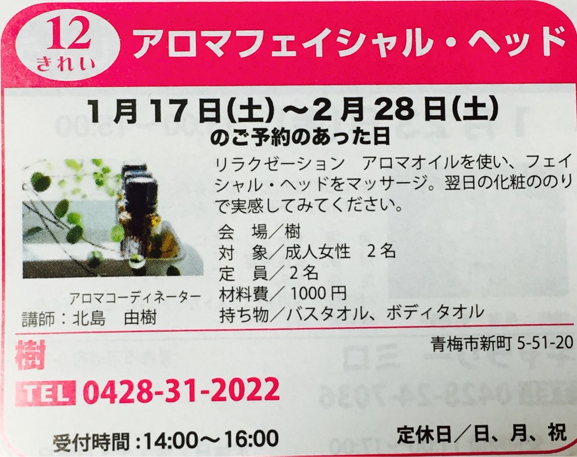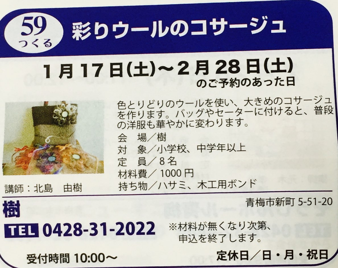 他には『アロマフェイシャル』と『彩りウールのコサージュ作り』もカフェ樹さんにて受付中です。