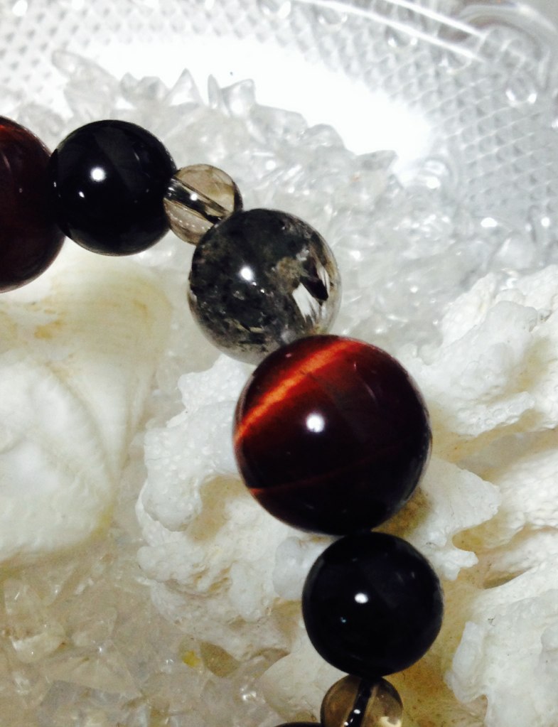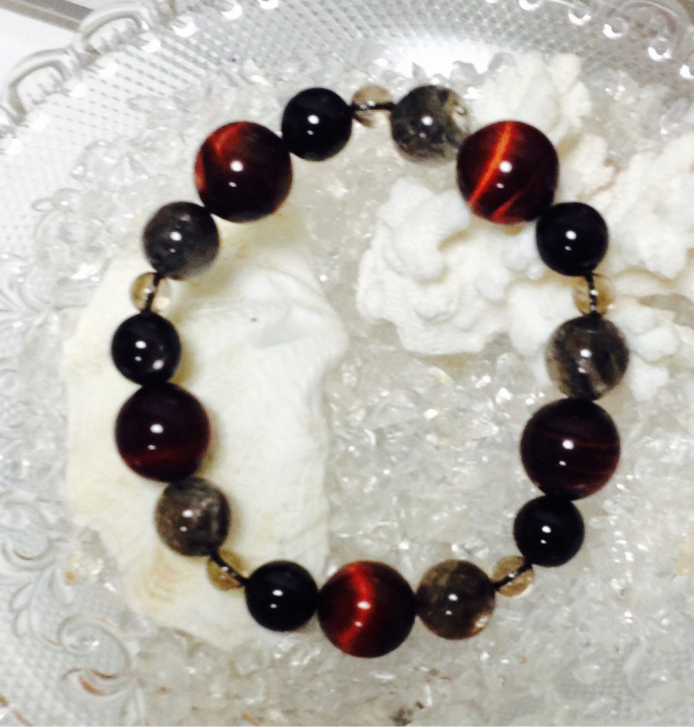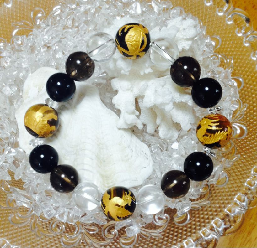 14ミリの大きめの四神獣のタイガーアイと、癒し効果のスモーキークォーツとお守り効果のオニキスで作られました。